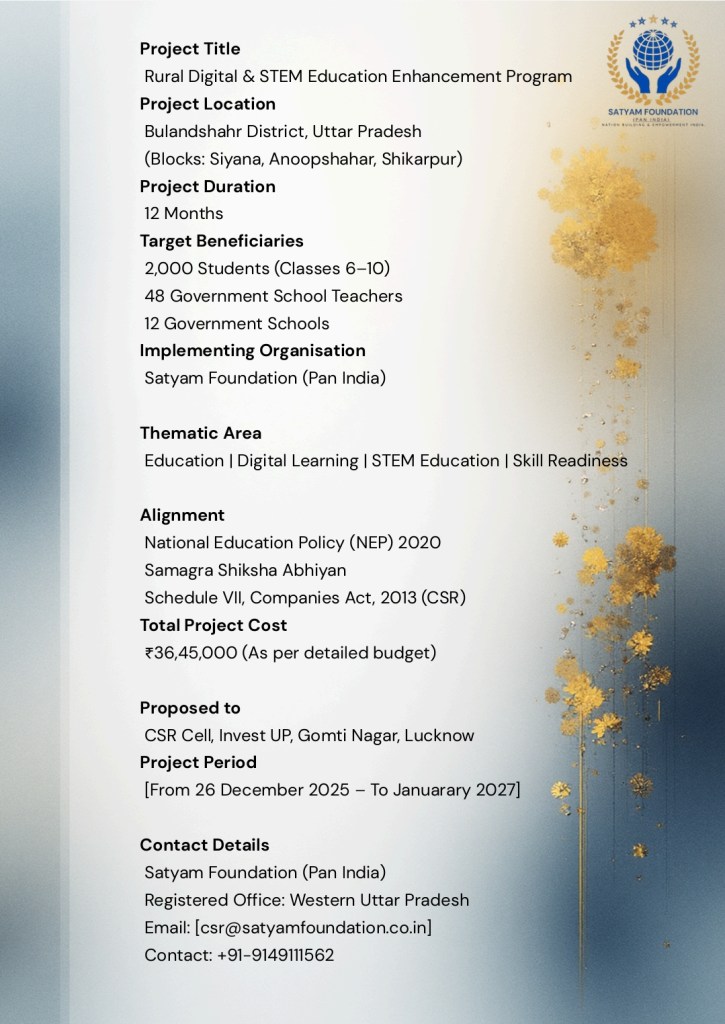 This initiative will be implemented in Bulandshahr District, Uttar Pradesh, covering the blocks of Siyana, Anoopshahar, and Shikarpur. The program is designed as a 12-month intervention focused on strengthening digital literacy and STEM education.